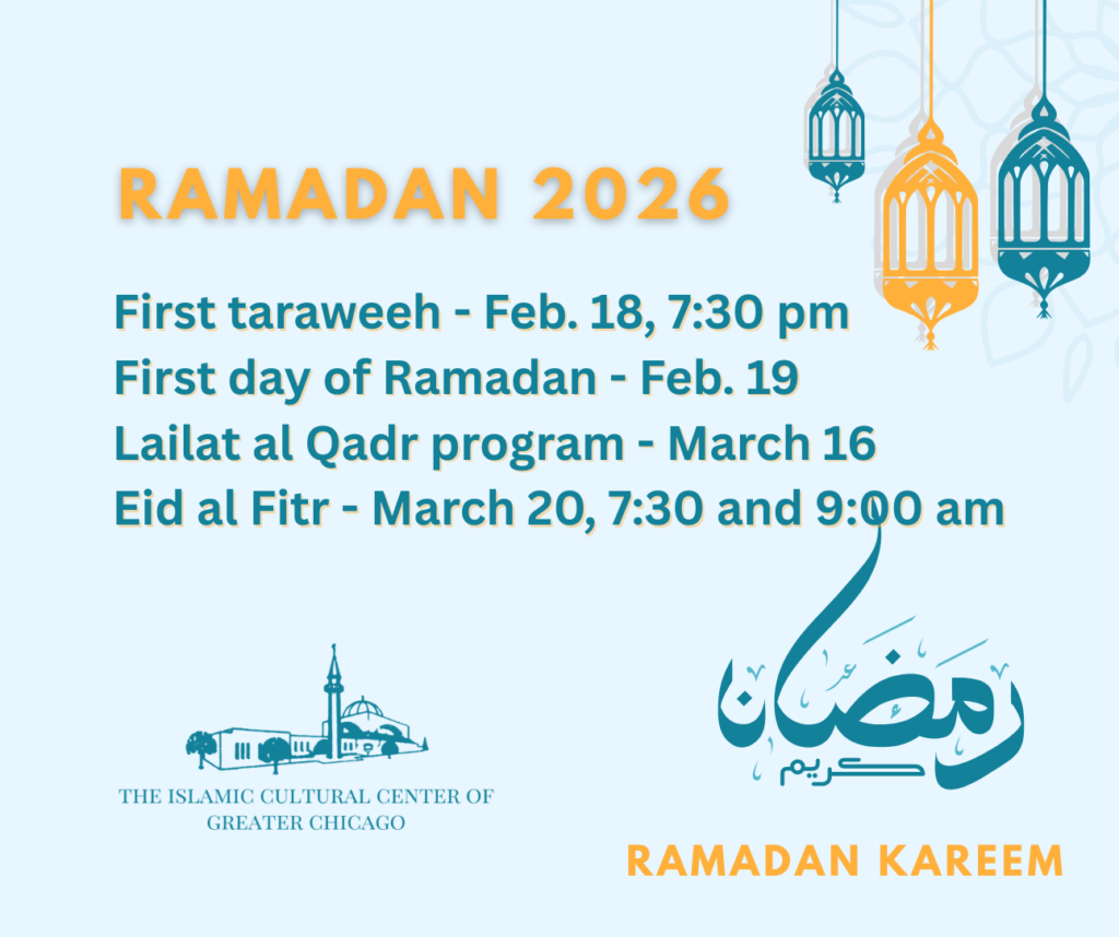 As we prepare to welcome the holiest month of the year, please save these important dates for our Ramadan 2026 programs at The Islamic Cultural Center of Greater Chicago. We look forward to seeing you all for prayers, reflection, and community insha’Allah.